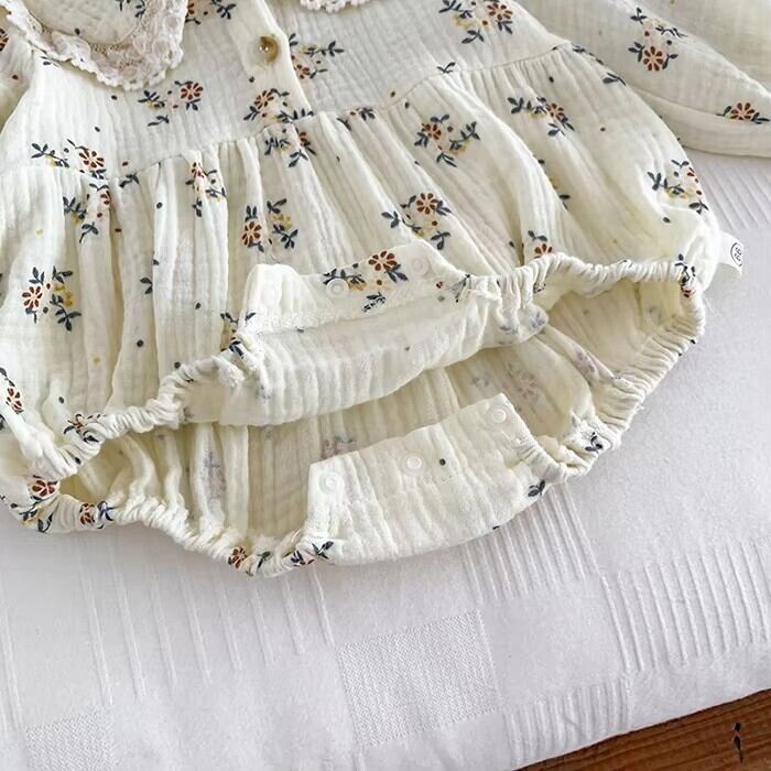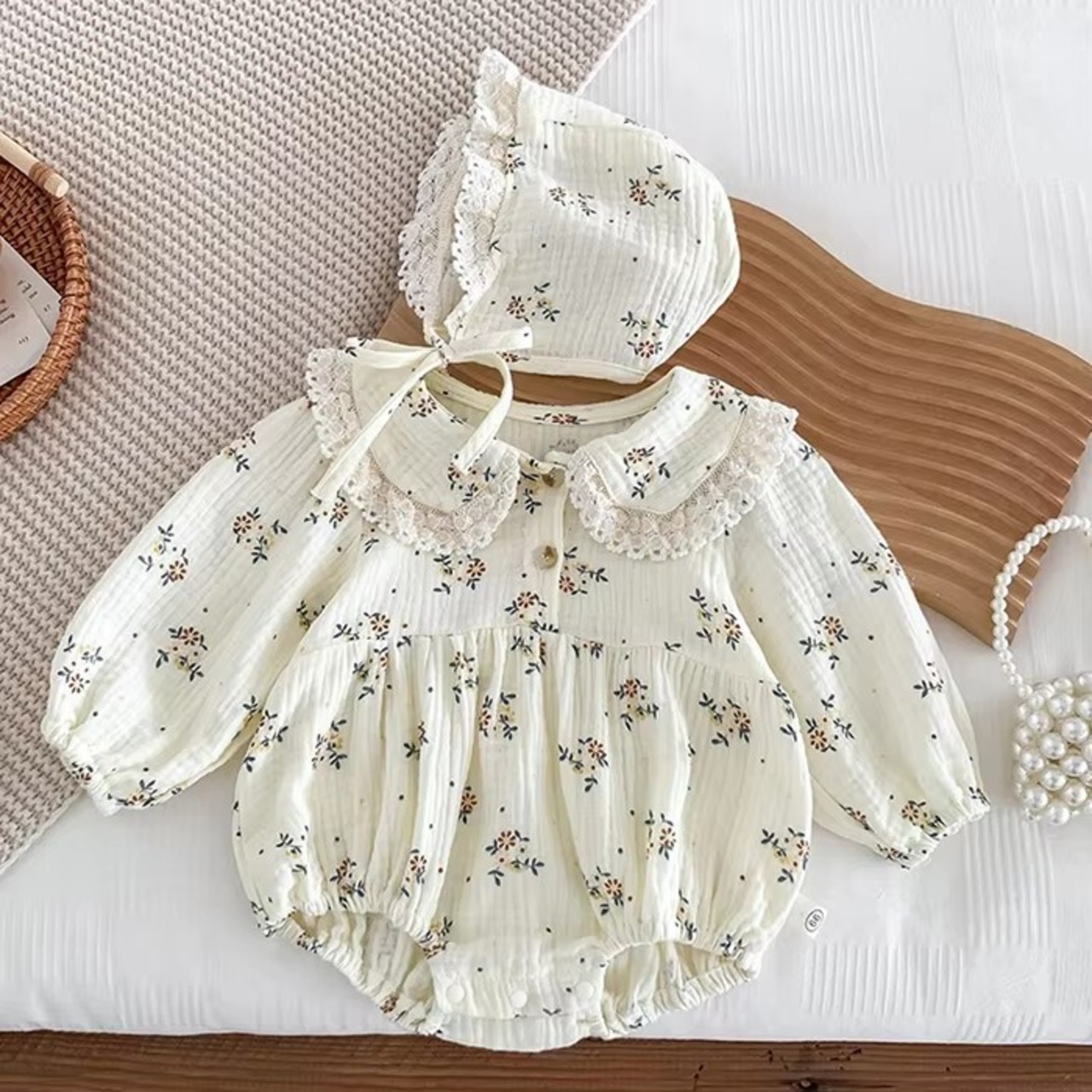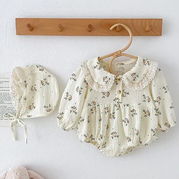 Floral Rompers/フローラルロンパース 女の子 ベビー ベビー服 子供服 花柄 長袖 ロンパース 赤ちゃん 丸襟 かわいい ガーリー ベビー ボンネット 帽子