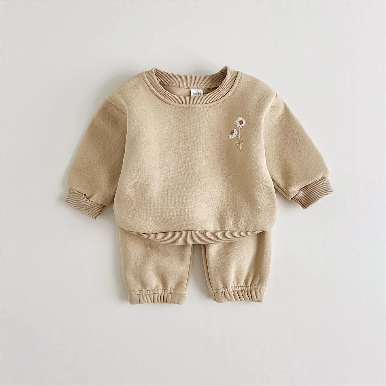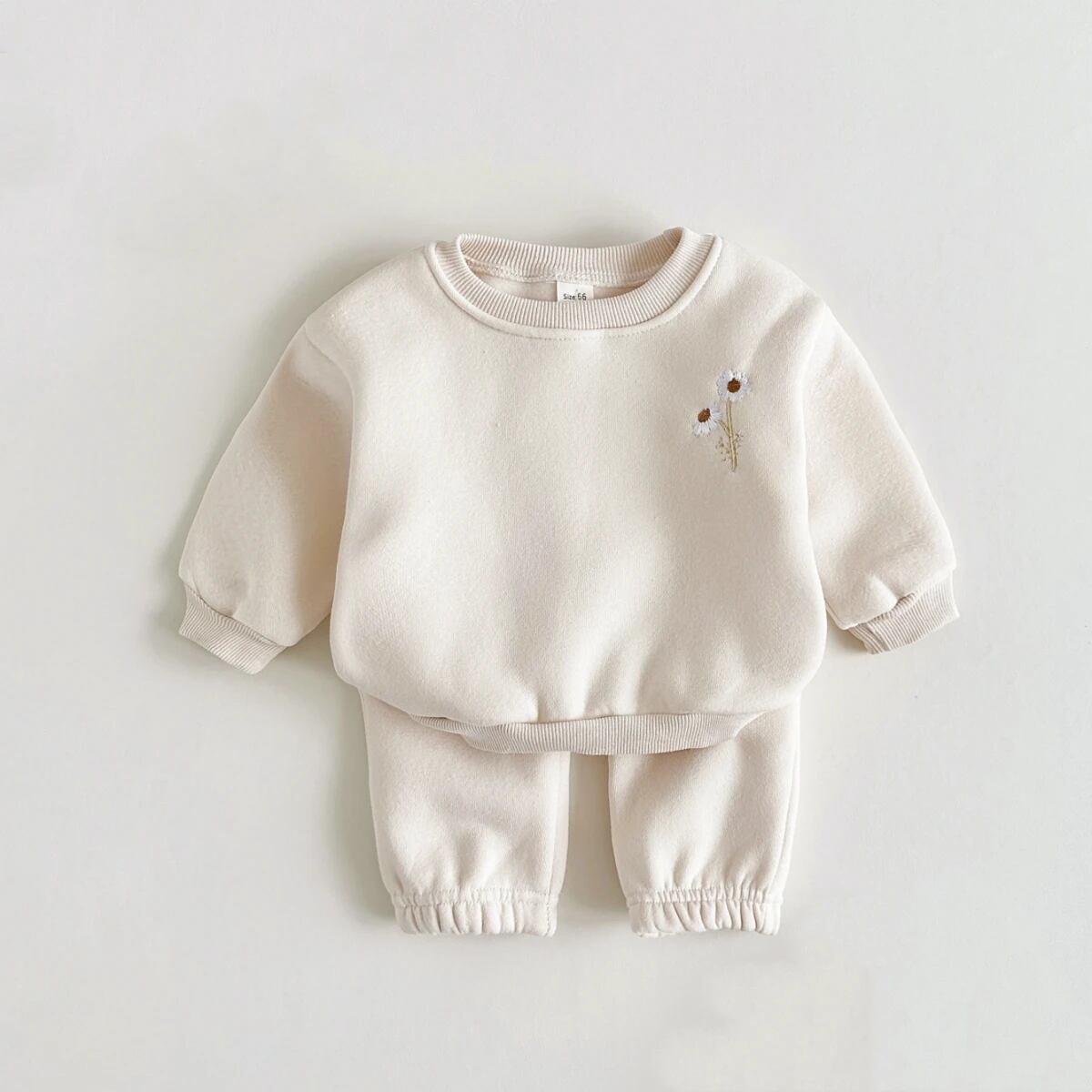 One point Floral Stitch Matching Set/ワンポイント花柄刺繍セットアップ ベビー セットアップ 長袖Tシャツ パンツ ワッフル 花柄 フラワー刺繍 胸 ワンポイント シンプル カーキ ベージュ 2カラー ユニセックス 男の子 女の子 子供服