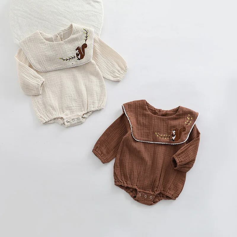 Squirrel Rompers/リス柄刺繍ロンパース 長袖 ロンパース 女の子 男の子 こども ベビー ベビー服 リス柄 刺繍