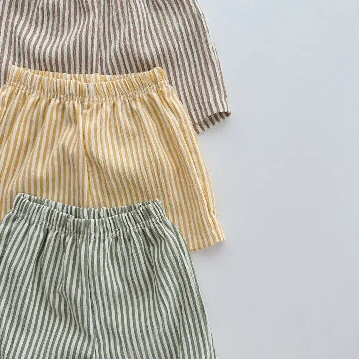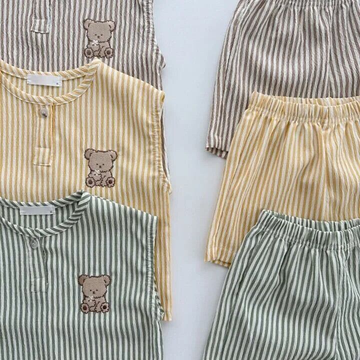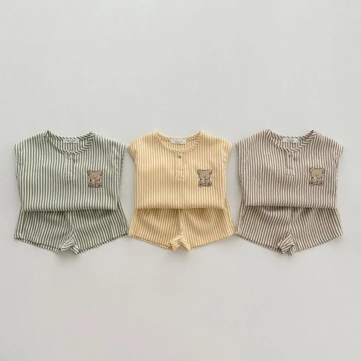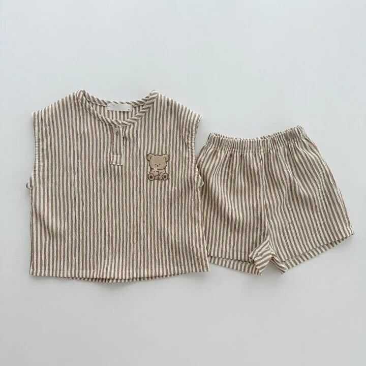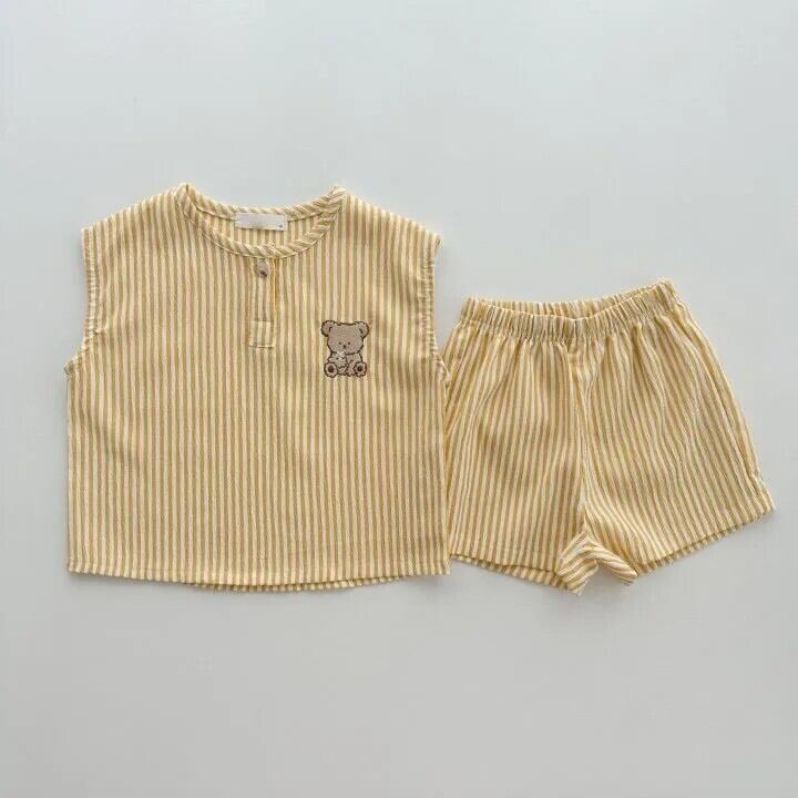 Kids Matching Set/セットアップ 子供服セット 男女兼用 キッズ ストライプ柄 上下セット クマ トップス+ショートパンツ 幼児 キッズ服セット